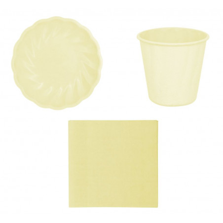 Lot Smiley World Jaune composé de : - 16 serviettes en papier, - 8 assiettes en papier, - 8 gobelets en papier