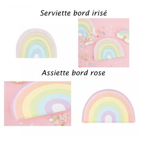 Lot Arc-en-ciel à bord rose composé de : - 8 assiettes en papier à bord rose long env 28cm,- 16 serviettes en papier à bord rose env 16cm,