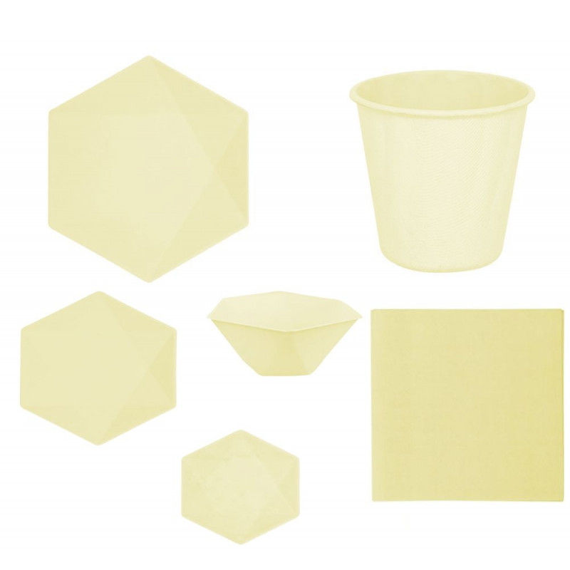 Lot Vert Decor JAUNE composé de : - 8 assiettes hexagonales de 26.1 x 22.6cm,- 8 gobelets en papier 310ml,- 20 serviettes en papier 33 x 33cm