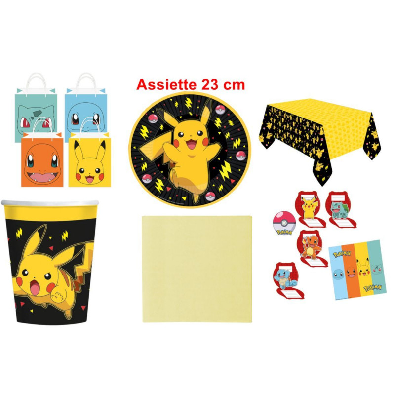 Lot POKEMON 4 JAUNE composé de : - 8 assiettes en papier de 23cm,- 20 serviettes en papier jaune, - 8 invitations + enveloppes,